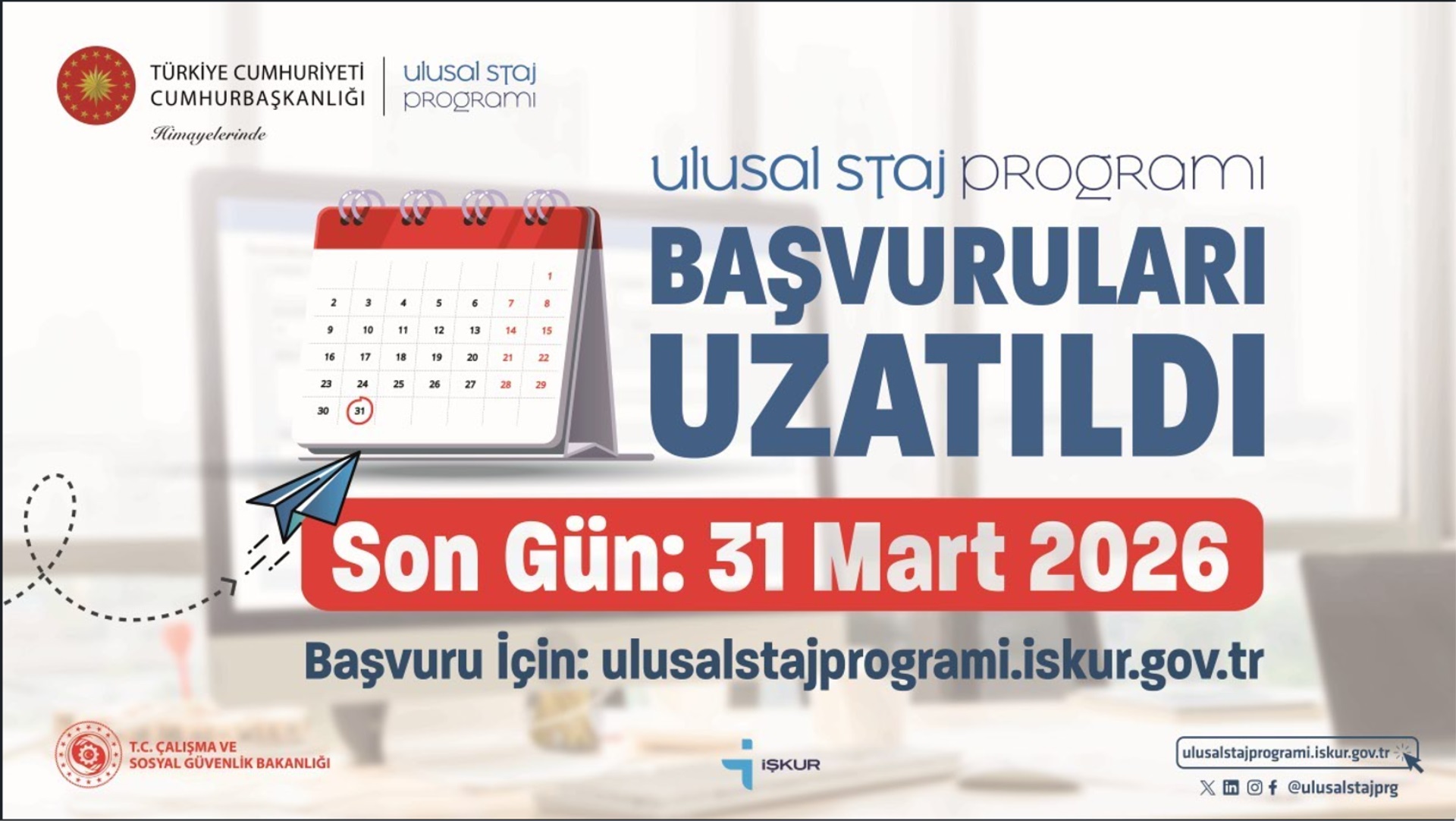 Cumhurbaşkanlığı Himayelerinde Türkiye İş Kurumu (İŞKUR) koordinasyonunda 2026 yılı “Ulusal Staj Programı” öğrenci başvuruları 06 Ocak 2026 tarihinde başlamış olup 31 Mart 2026 tarihi saat 23:59’a kadar devam edecektir.